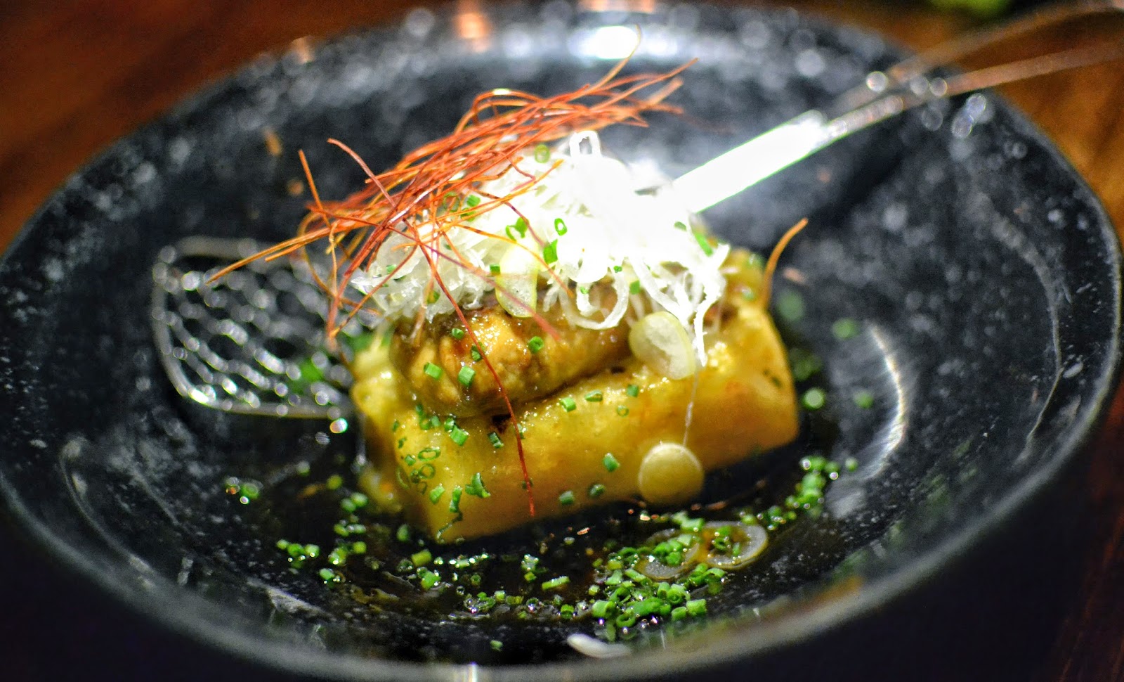 PAN SEARED FOIE GRAS ON AGEDASHI TOFU, SIGNATURE REDUCTION
